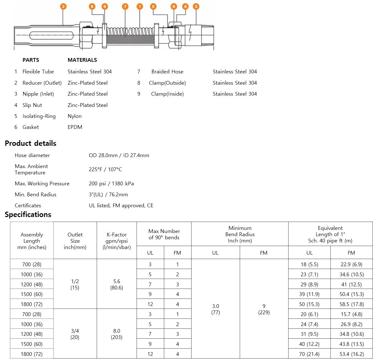Braided hoses are reinforced with stainless steel braiding to enhance mechanical strength and resistance to damage, vibrations, and seismic activity. They feature an inlet fitting for easy branch line connection, an outlet fitting for sprinkler attachment, and a ceiling bracket for secure mounting. Perfect for installations demanding durability and flexibility.